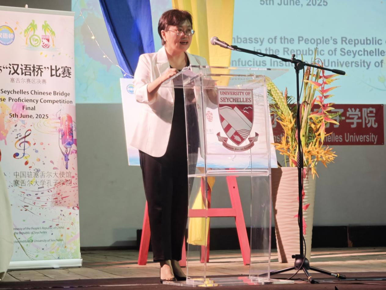 人民网内罗毕6月8日电 (记者黄炜鑫)维多利亚消息:2025年“汉语桥”世界大中学生中文比赛塞舌尔赛区决赛日前在塞舌尔大学举行,共有15名选手进入决赛。中国驻塞舌尔大使林楠,塞舌尔大学校长佩罗,华侨华人、高校师生代表等百余人出席。