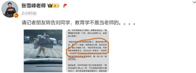 6月12日晚,知名教育博主张雪峰在微博上提到,“请记者朋友转告刘同学,教育学不是当老师的。”记者随后将这一建议告知了刘同学。灌阳县第二高级中学的於校长也表示,在报考学校和专业时,学校和老师会为刘同学提供指导。
