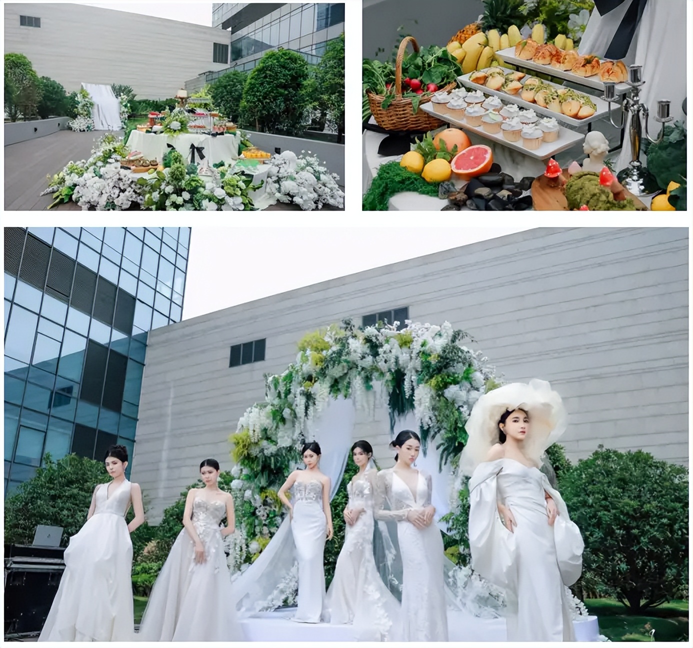 本次婚礼秀的核心亮点在于焕新启用的酒店2楼户外露台。这片占地约1000平方米的全新布局的场地,巧妙融合都市便利与自然意趣,精心打造成了一座绿意盎然的森系秘境。现场绿植葱郁,形成天然的浪漫屏障,开阔的观景台则提供了绝佳视野。飘逸的纱幔随风轻舞,精致的拱门花艺与潺潺流淌的瀑布造景相映成趣,共同营造出灵动而梦幻的氛围。精心布置的主题甜品区,更为整个场景增添了一份甜蜜气息。