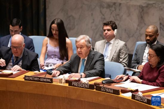 6月22日,在位于纽约的联合国总部,联合国秘书长古特雷斯(前中)在安理会就美国打击伊朗核设施召开的紧急公开会上发言。新华社记者 谢锷 摄