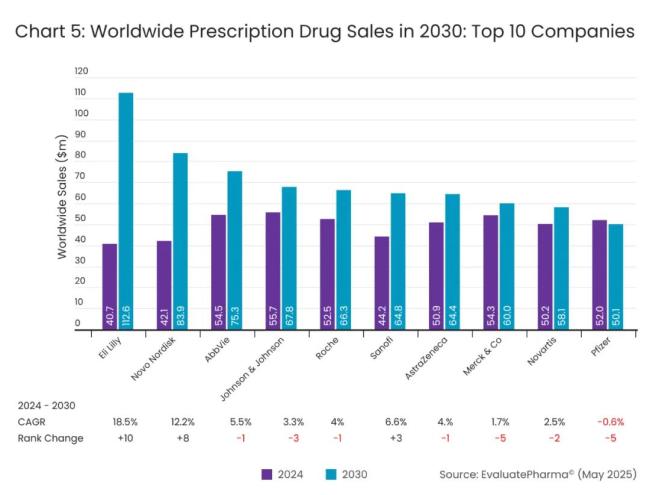 在EvaluatePharma的畅想中,礼来也将成为2030年营收最高的药企,增速一骑绝尘。