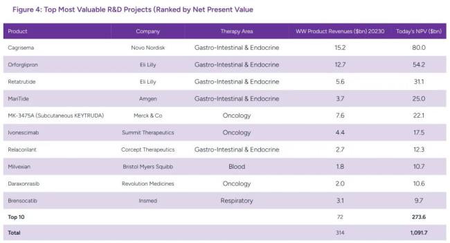 尽管如此,诺和诺德在糖尿病和肥胖领域的开发能力毋庸置疑。后续即将推出的司美格鲁肽复方药物Cagrisema被EvaluatePharma列为最具价值的研发项目,预计其峰值销售额将达到800亿美元。