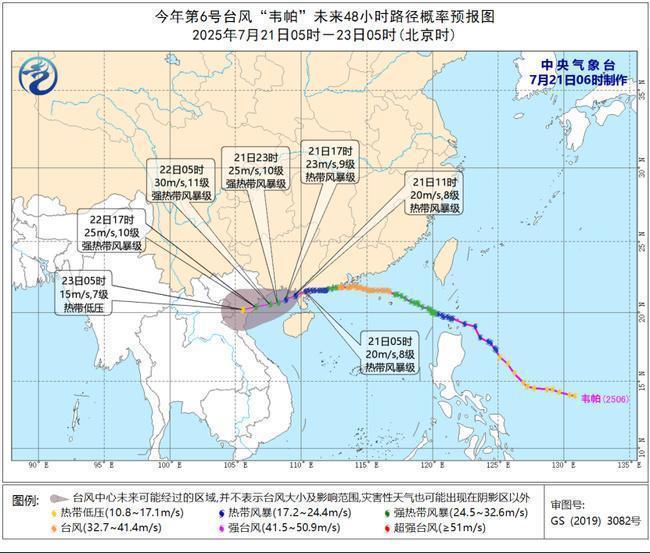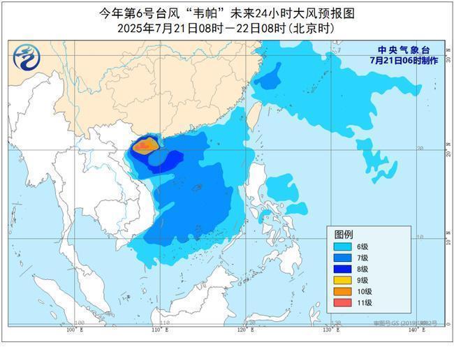 7月21日08时至22日08时,受“韦帕”和西南季风的共同影响,东海大部及钓鱼岛附近海域、巴士海峡、台湾海峡南部、南海大部、琼州海峡、东沙群岛、西沙群岛、中沙群岛、南沙群岛以及海南岛沿海、浙江沿海、广东中西部沿海、广西沿海等地将有6~7级风,阵风8~9级。北部湾、琼州海峡、广东西部沿海、广西沿海、海南岛沿海的风力可达8~9级,阵风10~11级,北部湾部分海域风力有10~11级,阵风12~13级。