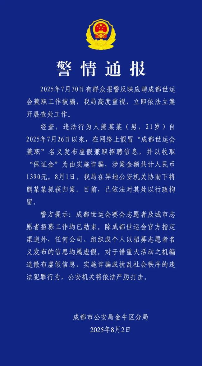 2025年8月2日,成都市公安局郫都区分局发布警情通报。同一天,成都市公安局金牛区分局也发布了警情通报。