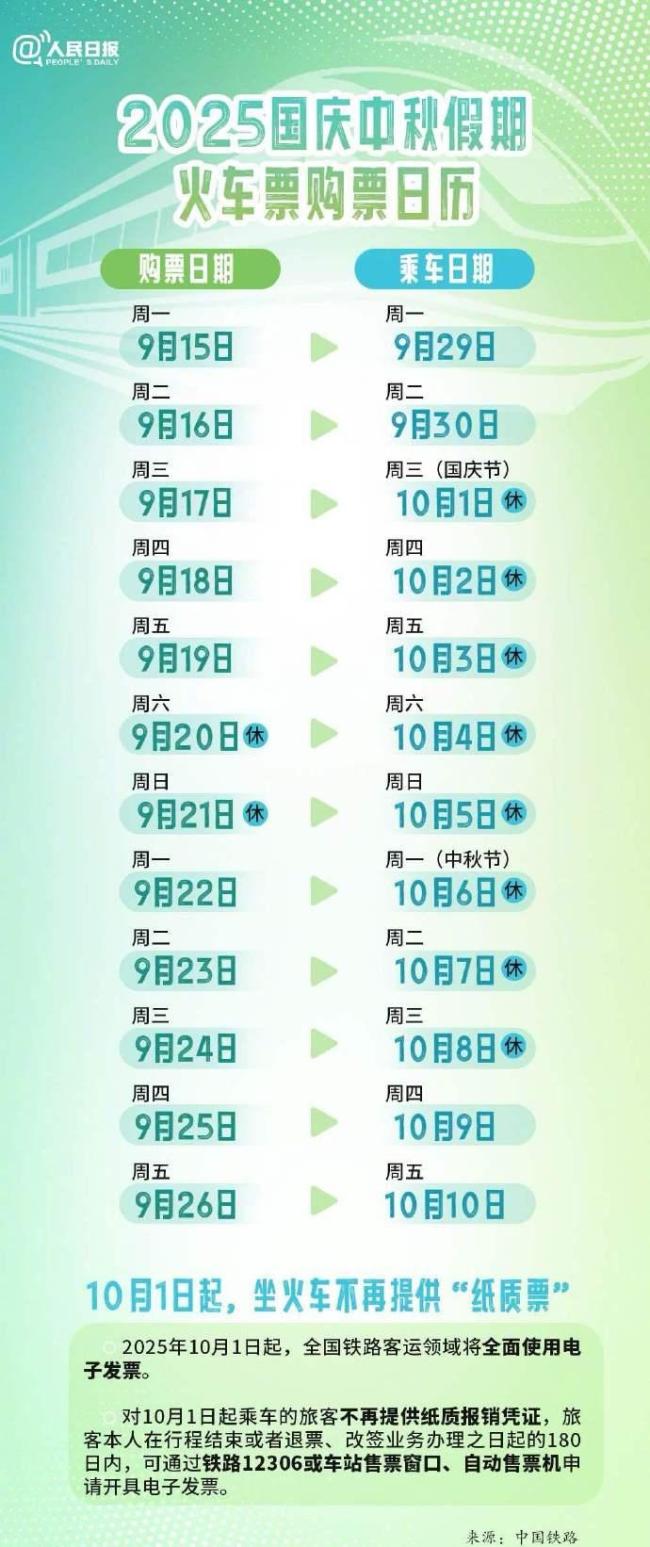 国庆中秋假期购票的关键时间如下: