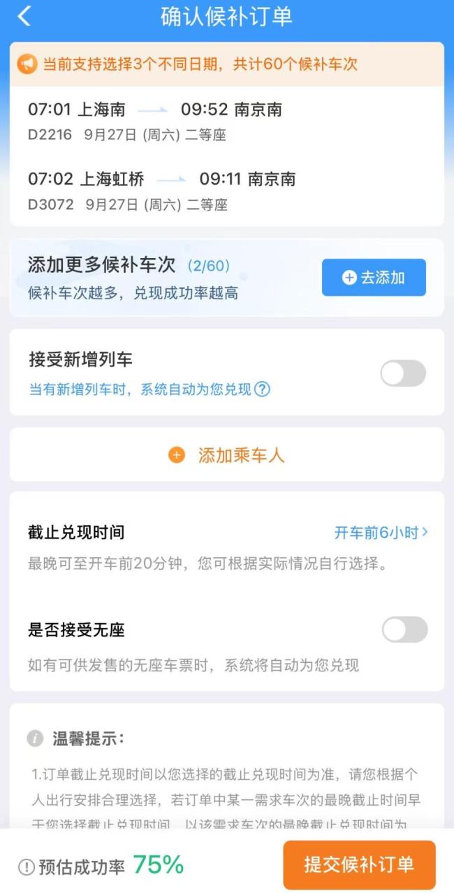 如果开票时没抢到票,可以尝试使用12306的候补购票功能。具体操作包括:在余票页面点击候补按钮,添加购物车;支持添加更多候补车次,每个用户同时可以保有6个待兑现候补订单,每个候补订单最多可选择3个乘车日期,总计添加不超过60个车次,最多可添加9位乘车人;打开“接受新增列车”模块,设置新增列车兑现条件;查看当前候补订单的预估成功率,预估成功率按照历史候补订单兑现情况测算,仅供参考。铁路12306大数据系统将根据客流需求变化动态调整票额投放,兼顾长途和短途旅客需求,在长途票额充足时,会自动分时段将部分票额转移到沿途各站,所有新增票额将优先配售给已提交候补购票订单的旅客。