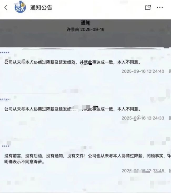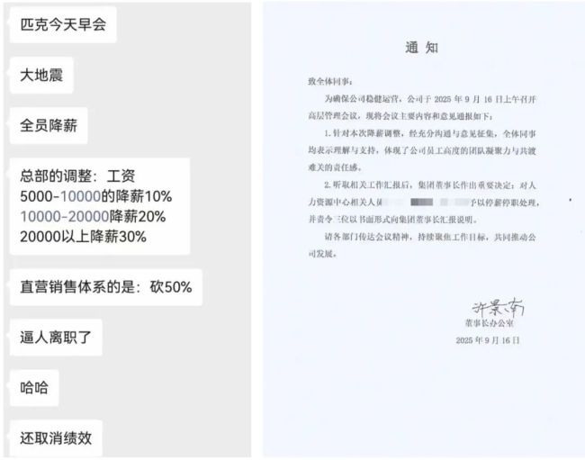 但受访员工几乎都不太认同“充分沟通”的措辞。有员工表示,9月11号(发薪日前四天)确实有开会讲过降薪一事并提及降薪的幅度。但当时没有征求大家同意的环节,会议也不是全员参加。会后没发布正式的文件公告、也未进行一对一沟通,大家月中发完工资以后董事长才发了那个落款为9月16号的通知。