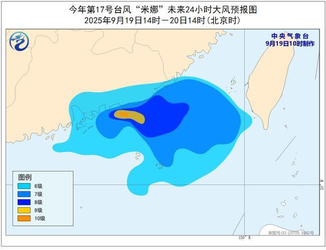 大风预报:19日14时至20日14时,南海北部、福建南部沿海、广东中东部部分地区和沿海将有6-8级大风,阵风9-10级,其中,广东中部沿海、南海东北部的部分海域风力有9-10级,阵风11-12级。