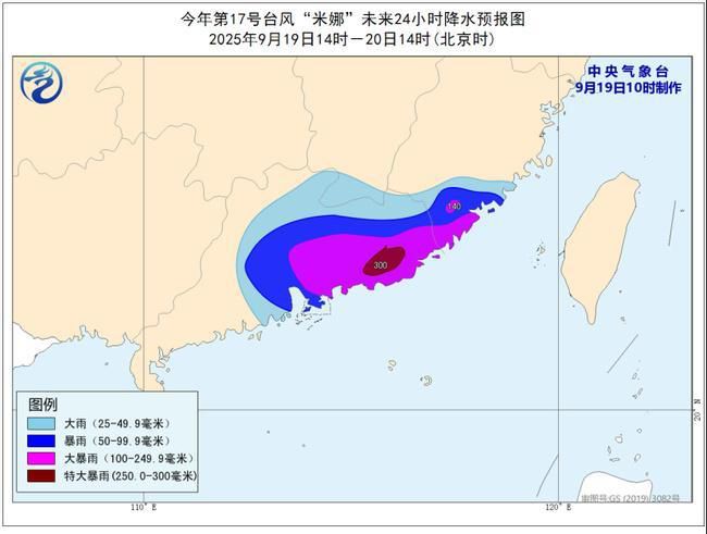 降水预报:19日14时至20日14时,福建南部、广东中东部、江西南部等地有大雨或暴雨,其中,广东东部、福建东南部等地的部分地区有大暴雨,局地有特大暴雨(250~300毫米)。