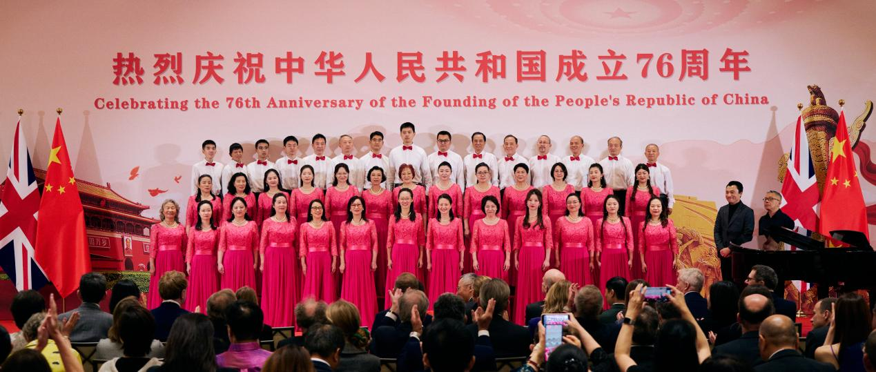 使馆合唱团以及伦敦华人爱乐合唱团联袂献曲迎国庆。杨浩鹏摄