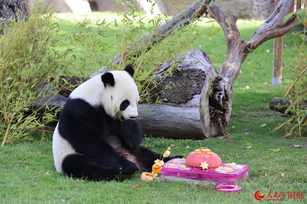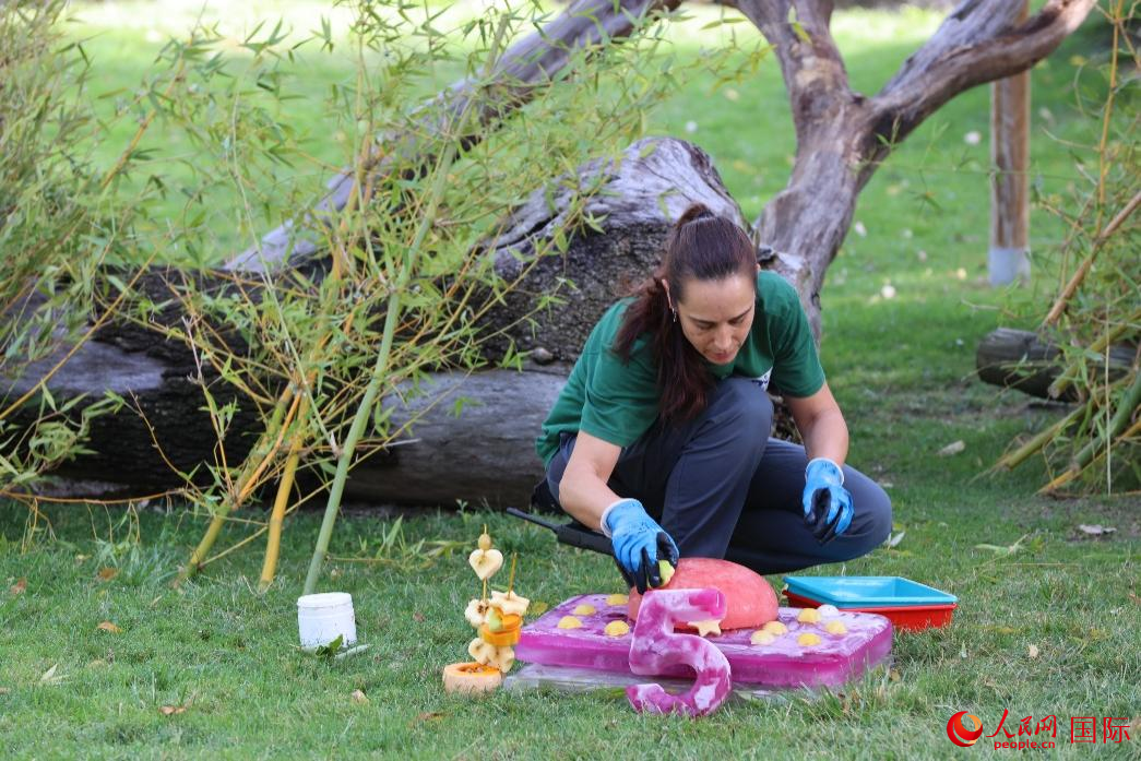 人民网马德里9月20日电 (记者许海林、颜欢)当地时间9月20日,西班牙马德里动物园为去年4月抵达马德里的大熊猫“金喜”和“茱萸”举办生日会,庆祝它们的5岁生日。