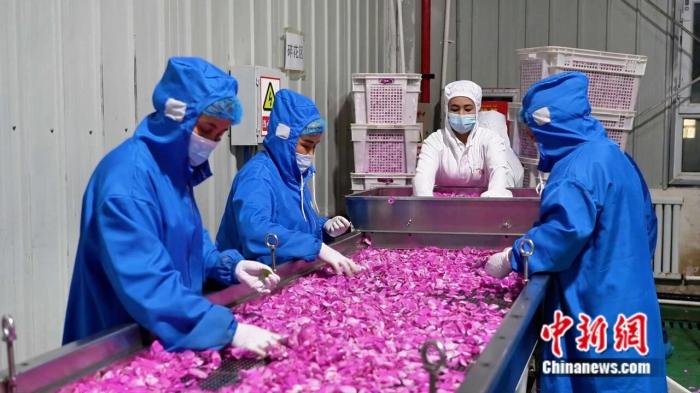 工人清洗玫瑰花瓣。于田县融媒体中心供图