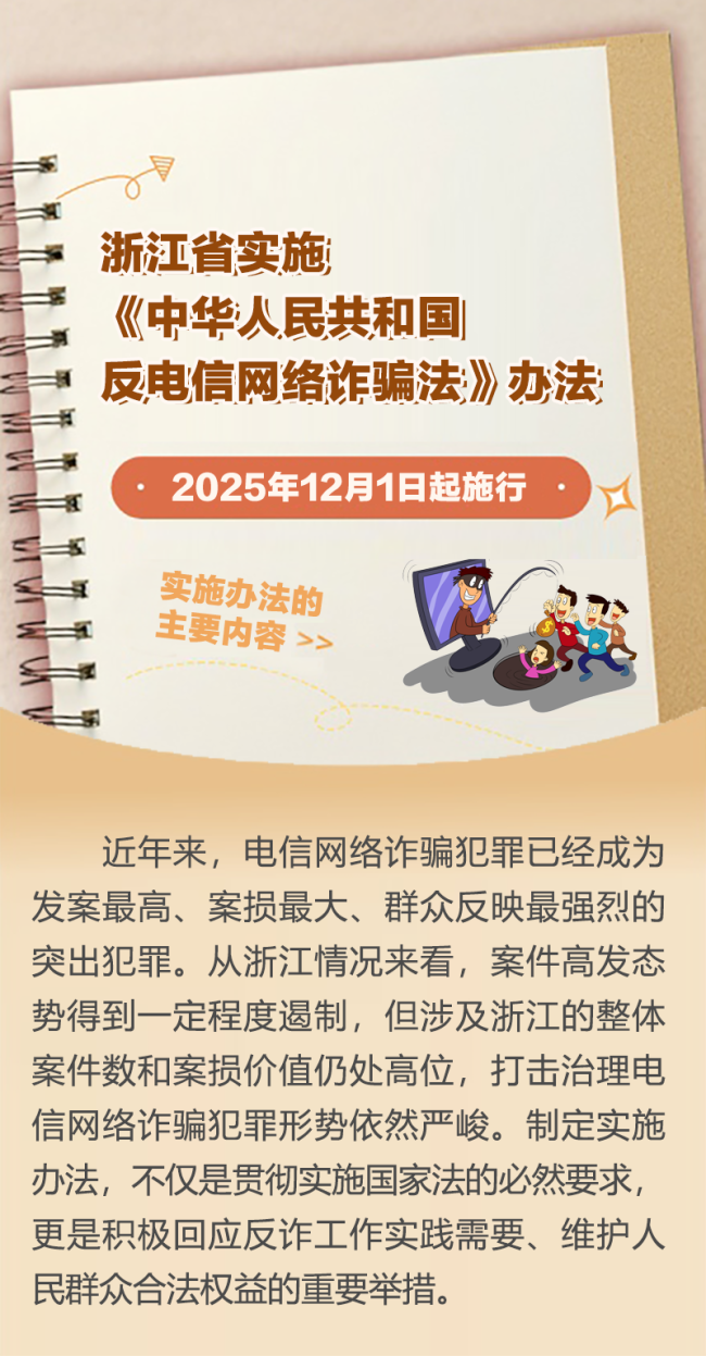 9月26日,浙江省第十四届人大常委会第十九次会议审议通过了《浙江省实施办法》,该办法将于2025年12月1日起施行。这是全国首部反诈领域的地方性法规。