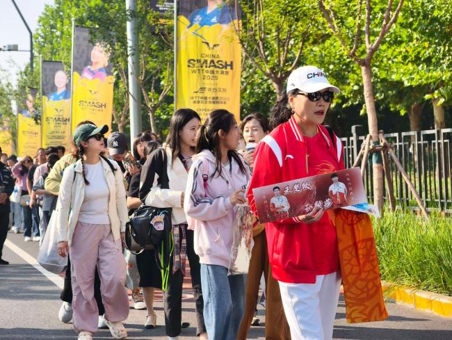 入口处设立的巨幅赛事背板成为焦点,众多球迷驻足合影打卡,记录这一乒乓盛宴的开幕时刻。笑容洋溢的脸庞与写满祝福的背板相映成趣,构成一道亮丽的风景线。这项顶级赛事的回归点燃了球迷的热情,也再次彰显了乒乓球运动在中国的深厚底蕴与无限活力。