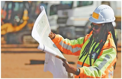 中国电建南非绿洲储能项目工作人员在查看图纸。