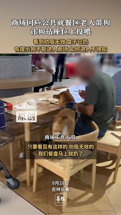 商场公共就餐区老人带狗上桌。近日,吉林长春一商场,一位老人带着狗在公共就餐区域上桌。对此,商场工作人员回应称,只要看到这种情况就会劝阻,劝阻无效会将相关餐盘扔掉,有提示贴提醒大家不允许带狗进入,但什么素质的顾客都有,并且该区域约有2000多平,有20多个门,又是中午饭点,确实是没看到该顾客。