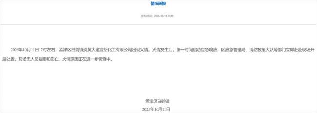 10月11日17时左右,河南省洛阳市孟津区白鹤镇炎黄大道宸岳化工有限公司发生火情。火情发生后,当地政府迅速启动应急响应机制,区应急管理局和消防救援大队等部门立即赶往现场进行处置。幸运的是,现场没有人员被困或伤亡,但火情的具体原因仍在进一步调查中。