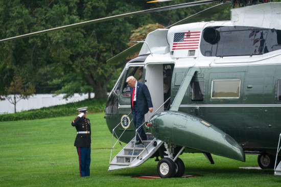 9月30日,在美国首都华盛顿,美国总统特朗普乘直升机返抵白宫。新华社记者胡友松摄