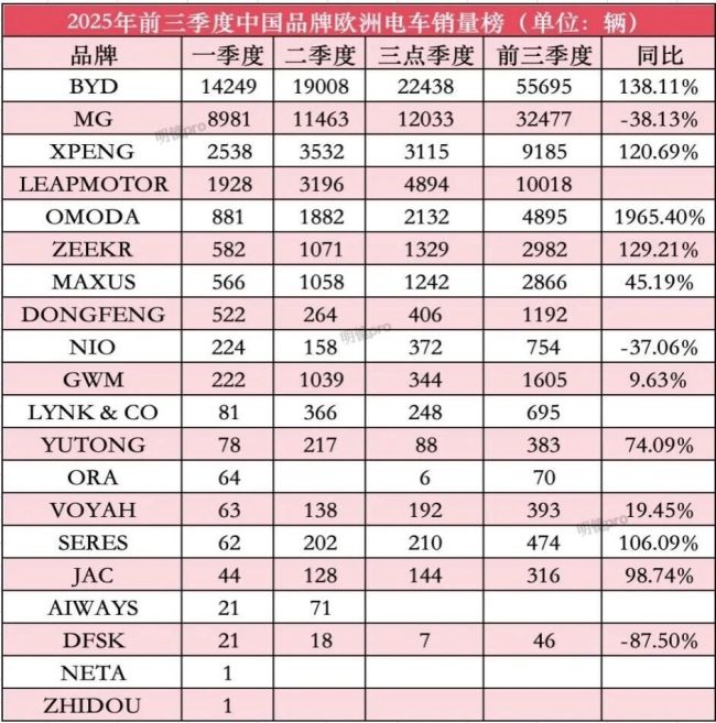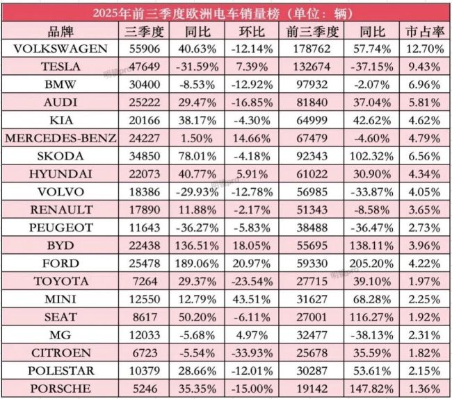2025三季度欧洲电车榜:中国车大反攻,比亚迪第一,零跑暴涨超百倍