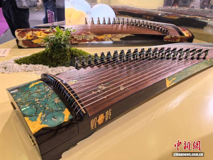 MusicChina2025上展出的系列民族乐器与世界名作《杏花盛开》结合,大漆工艺的千年古韵与自然舒展的杏花树融合,传统民族乐器便有了印象派的生命律动。(中新网记者陈静 摄)
