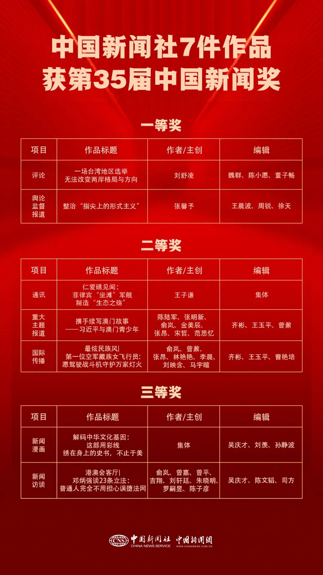 11月5日,第35届中国新闻奖揭晓。中国新闻社7件作品获奖,其中,一等奖2个,二等奖3个,三等奖2个。