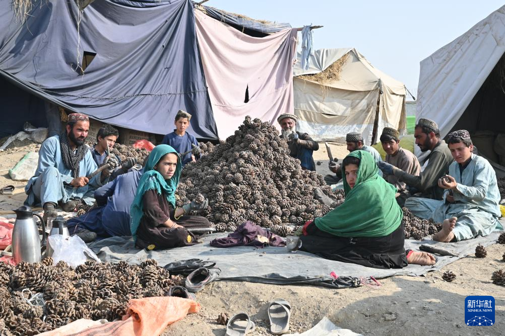 这是10月28日在阿富汗霍斯特省拍摄的松子加工交易市场。用木棍将松子从松塔中敲出来是当地人采集松子的方式。 新华社记者 张艺缤 摄