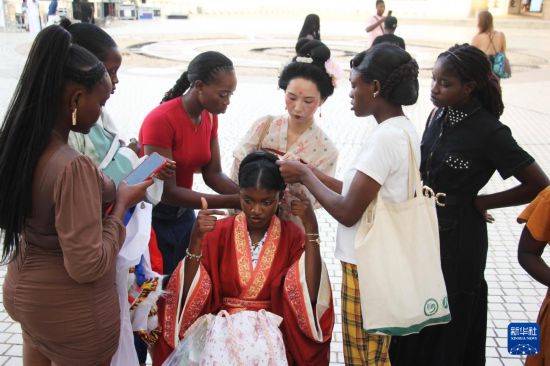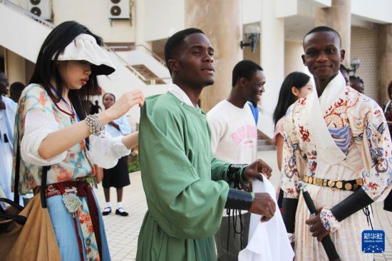 11月8日,在贝宁经济首都科托努举行的“中国贝宁服装秀”活动中,阿波美卡拉维大学孔子学院学生在穿戴中国传统服饰。新华社发(塞拉芬摄)