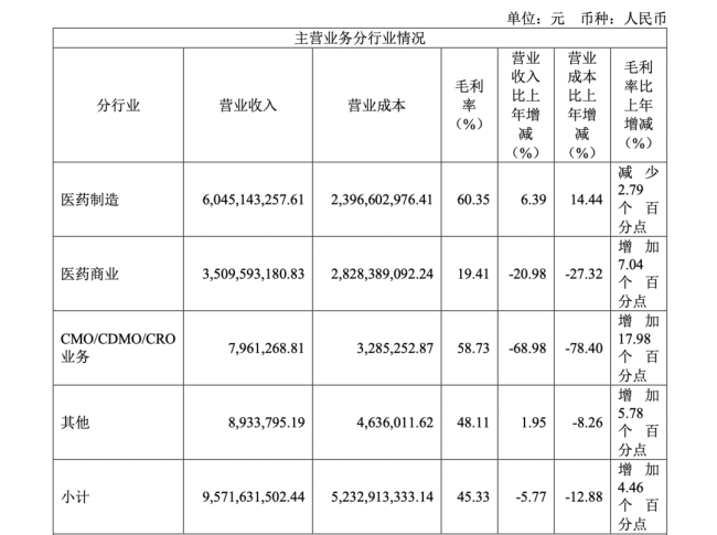 2024年海正药业主营业务分行业情况