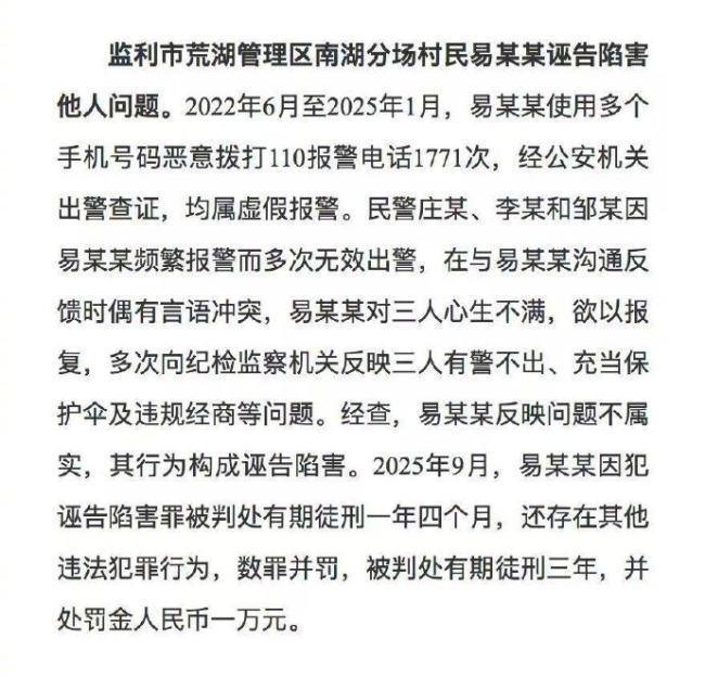 一则案例显示:监利市荒湖管理区南湖分场村民易某某诬告陷害他人问题。2022年6月至2025年1月,易某某使用多个手机号码恶意拨打110报警电话1771次,经公安机关出警查证,均属虚假报警。