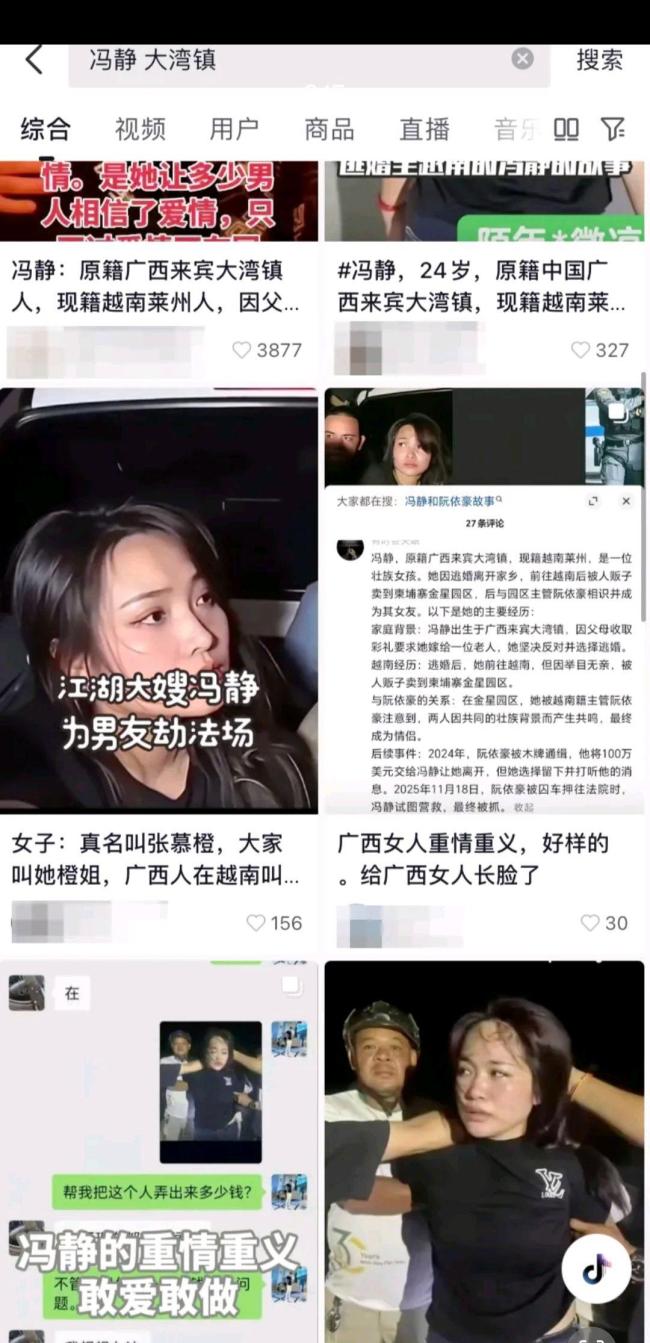 11月18日,柬埔寨柴桢省初级法院发生了一起劫囚事件,6名涉嫌跨境电诈和贩毒的囚犯在庭审前被人劫走。现场拍摄到一名女子向囚犯递枪的画面被广泛传播,随后各类自媒体开始编撰各种版本的故事。这些故事将涉事女子命名为冯静,并将其描述为逃婚越南、被卖至柬埔寨电诈园区后遇“大哥”阮依豪相救,为报恩情带枪劫狱的江湖叙事。更有甚者,称阮依豪曾赠予她百达翡丽手表和100万美元,两人是“生死相依的情侣”。