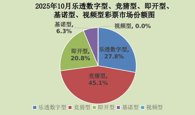 10月份,乐透数字型彩票销售130.29亿元,同比增加1.94亿元,增长1.5%;竞猜型彩票销售211.37亿元,同比增加9.43亿元,增长4.7%;即开型彩票销售97.48亿元,同比增加15.35亿元,增长18.7%;基诺型彩票销售29.79亿元,同比减少0.04亿元,下降0.1%。10月份,乐透数字型、竞猜型、即开型、基诺型彩票销售量分别占彩票销售总量的27.8%、45.1%、20.8%、6.3%。视频型彩票销售0.0049亿元,同比增加0.0038亿元。