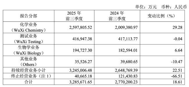 2025年前三季度,药明康德实现营收328.57亿元,同比增长18.61%;归属于上市公司股东的净利润95.22亿元,同比增长42.51%。分业务板块来看,前三季度药明康德化学业务、测试业务、生物学业务、其他业务板块分别实现营收259.78亿元、41.69亿元、19.47亿元、3.52亿元。