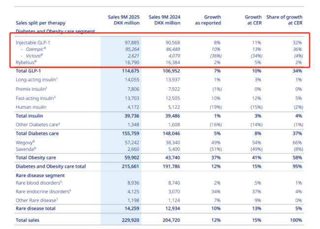 诺和诺德凭借其明星产品司美格鲁肽的强劲表现,在减重药物领域保持领先地位。2025年前三季度,诺和诺德糖尿病与肥胖护理业务总收入达2156.61亿丹麦克朗(约合332.4亿美元),同比增长15%。