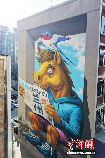 11月28日,航拍位于甘肃省兰州市城关区街头的大型卡通“铜奔马”3D墙绘。(无人机照片)中新社记者 李亚龙 摄