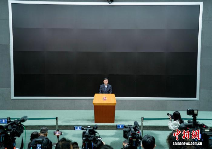 12月2日,香港特区行政长官李家超出席行政会议前在特区政府总部会见记者,现场大屏幕设置为黑色,以悼念大埔宏福苑火灾罹难者。中新社记者 侯宇 摄