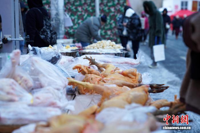 12月2日,黑龙江哈尔滨,冻鸡摆上街头售卖。当日,哈尔滨最高气温今冬首次降到-10℃以下,室外秒变“天然大冰箱”,商贩将冻鱼、冻鸡、冻柿子等摆上街头售卖。 中新社记者 赵宇航 摄