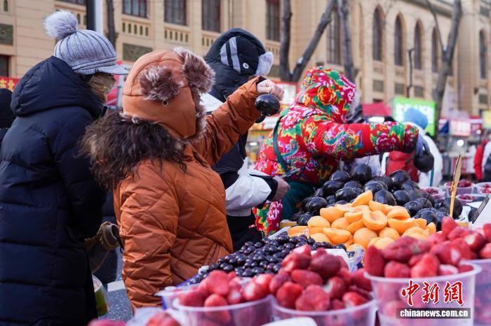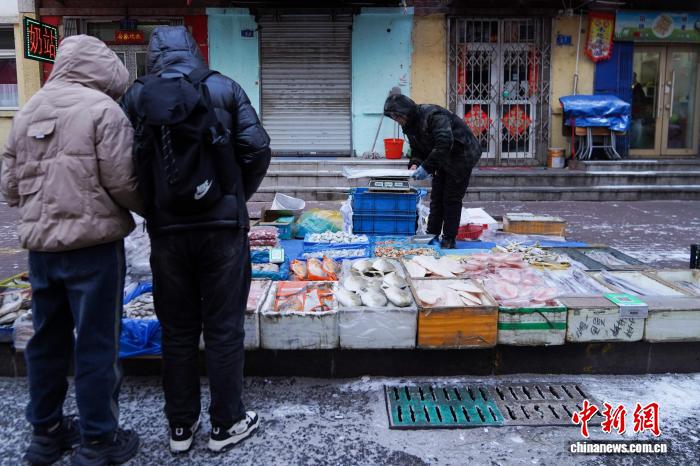 12月2日,黑龙江哈尔滨,市民选购冻货。当日,哈尔滨最高气温今冬首次降到-10℃以下,室外秒变“天然大冰箱”,商贩将冻鱼、冻鸡、冻柿子等摆上街头售卖。 中新社记者 赵宇航 摄