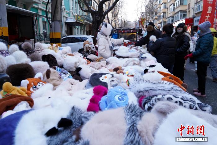 12月2日,黑龙江哈尔滨,游人试戴保暖物品。当日,黑龙江哈尔滨最高气温今冬首次降到-10℃以下 ,在哈尔滨红专街早市,棉帽子、大花袄等保暖物品摆上街头,游人纷纷选购。中新社记者 赵宇航 摄