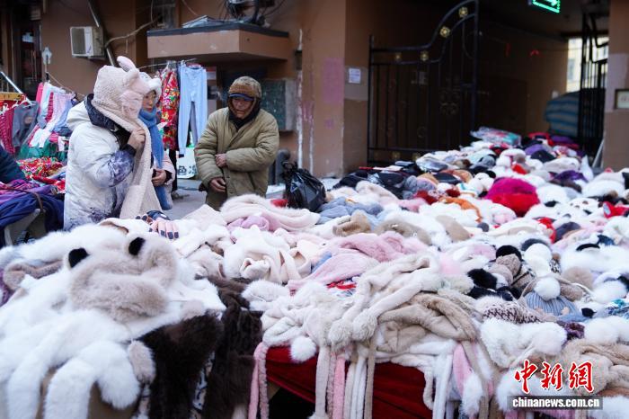 12月2日,黑龙江哈尔滨,游人选购保暖衣物。当日,黑龙江哈尔滨最高气温今冬首次降到-10℃以下 ,在哈尔滨红专街早市,棉帽子、大花袄等保暖物品摆上街头,游人纷纷选购。中新社记者 赵宇航 摄