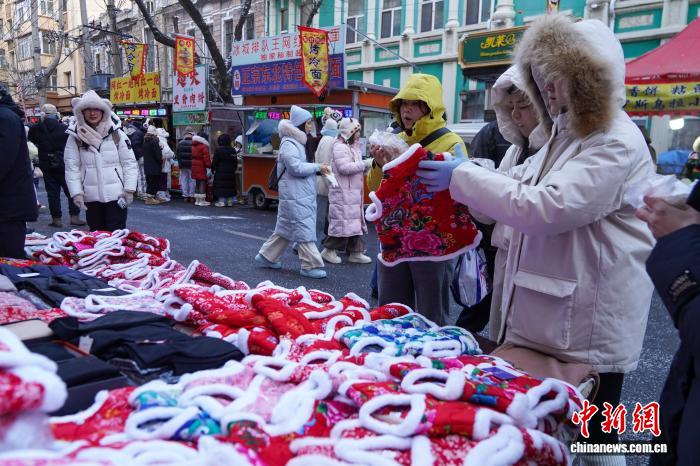 12月2日,黑龙江哈尔滨,游人选购花袄。当日,黑龙江哈尔滨最高气温今冬首次降到-10℃以下 ,在哈尔滨红专街早市,棉帽子、大花袄等保暖物品摆上街头,游人纷纷选购。中新社记者 赵宇航 摄