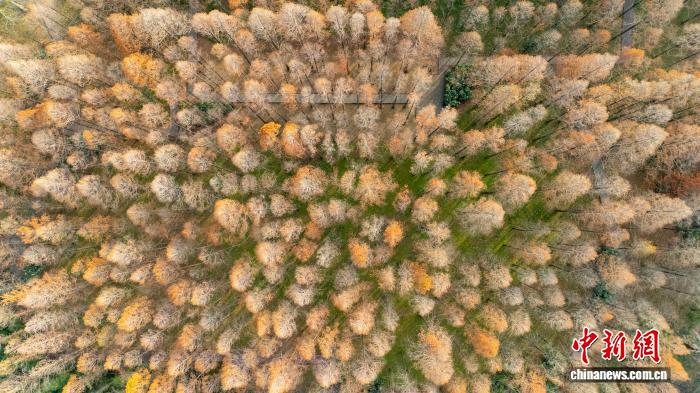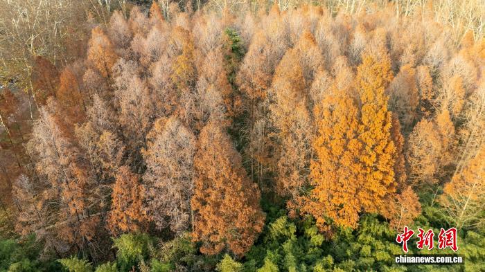 12月1日,位于河南郑州黄河迎宾馆的水杉林一片绯红,层林尽染,成为冬日里“美拉德”色系的别致风景。图为多彩斑斓的初冬树林。(无人机照片)赵梦阳 摄