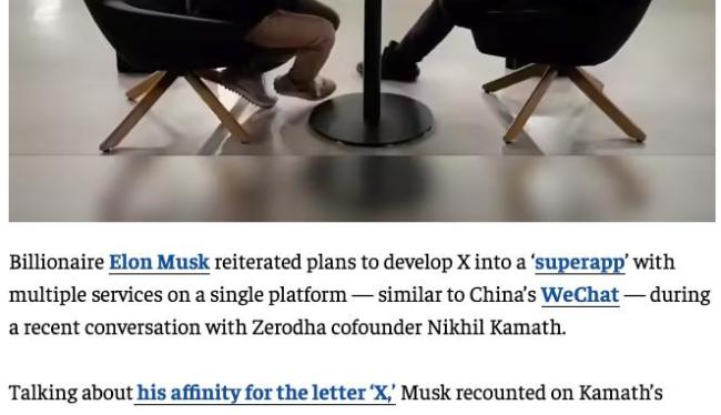 特斯拉首席执行官埃隆·马斯克在与Zerodha联合创始人尼基尔·卡马斯的对话中表示,他希望将社交平台X打造成中国以外的“微信升级版”,使其具备信息发布和金融支付等多种功能。这次交流是在播客节目“People by WTF”中进行的。