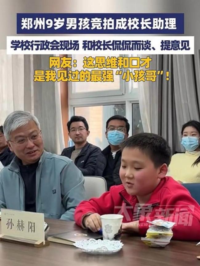 近日,河南郑州一名四年级小学生孙赫阳在校内竞拍中,以5块1的校园币成功竞拍成为校长助理,并获得了参加学校行政会的资格。在行政会上,他坐在校长旁边品茶、吃零食,与校长侃侃而谈,提出意见并分析问题,逻辑清晰且表现得非常放松。现场的老师们都被他的表现震惊了。