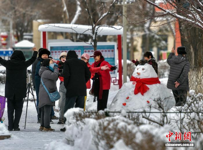 12月11日,一夜降雪后,新疆乌鲁木齐市气温骤降10℃至15℃左右,市民在街头游园中堆起雪人。受强冷空气影响,12月10日该市出现强降雪及大风天气,气象部门相继发布寒潮和暴雪预警信号。中新社记者 刘新 摄