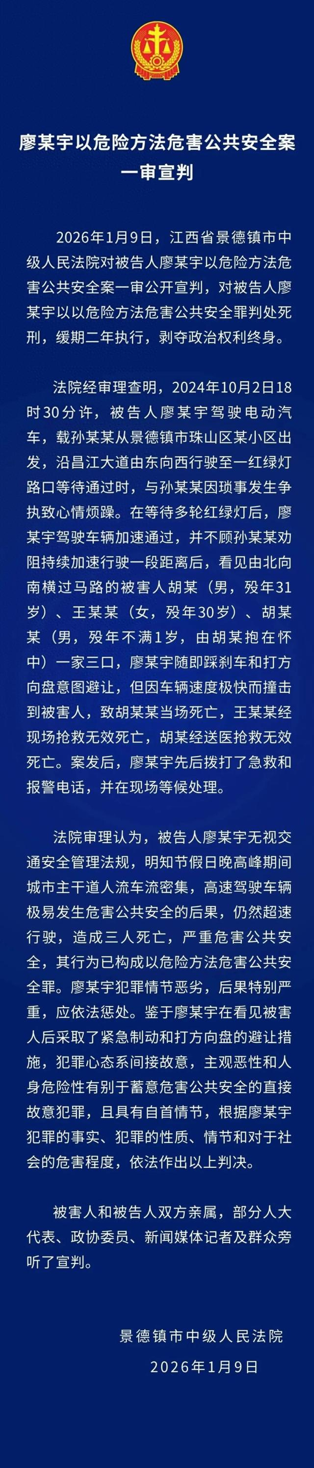 法院回应为何对廖某宇判死缓 景德镇中院判后答疑!2026年1月9日,江西省景德镇市中级人民法院对被告人廖某宇以危险方法危害公共安全案进行了一审公开宣判。法院判处廖某宇死刑,缓期二年执行,并剥夺其政治权利终身。
