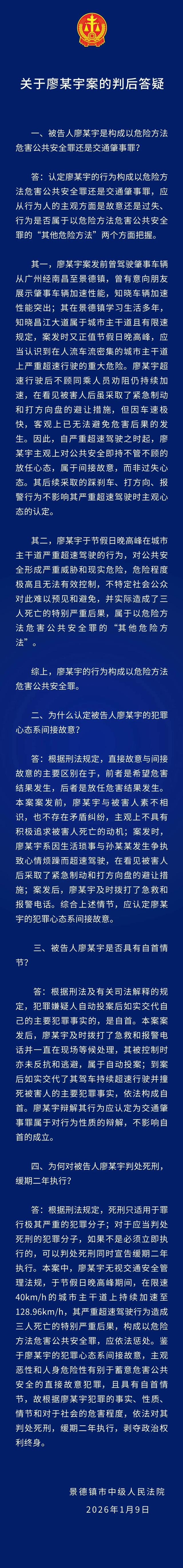 法院回应为何对廖某宇判死缓 景德镇中院判后答疑