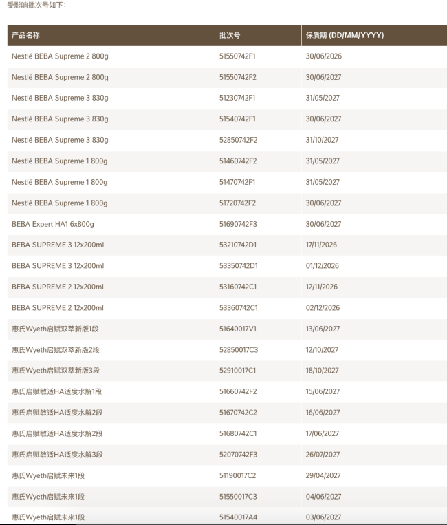 雀巢中国预防性自愿回收婴幼儿配方奶粉