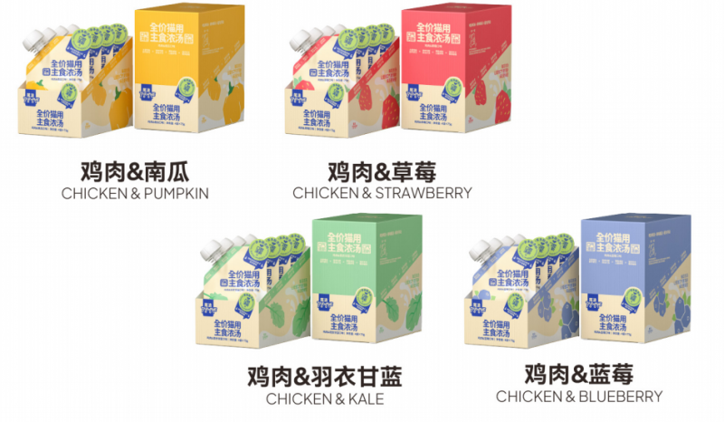 这四款专研口味包括:鸡肉&南瓜口味,特别添加蒲公英成分,利用其天然利尿特性,助力泌尿系统健康;鸡肉&蓝莓口味,特别添加白茅根成分,有效提升汤汁适口性,鼓励猫咪主动增加饮水量;鸡肉&羽衣甘蓝口味,特别添加车前子成分,其富含的膳食纤维有助于促进肠道蠕动,改善消化,缓解便秘困扰;鸡肉&草莓口味,特别添加蔓越莓成分,凭借其中有益的原花青素,为尿道健康提供多一层保护。所有口味均以真材实料熬制的浓郁高汤为基底,并巧妙辅以红枣、胡萝卜等天然调味食材,在实现特定功能益处的同时,确保了鲜美风味,让健康管理在猫咪愉悦的舔食中自然完成。