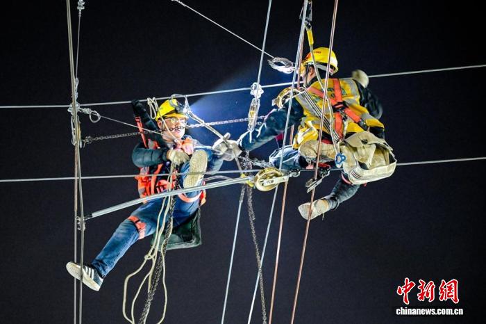 作业人员正在进行接触网施工作业。记者 刘忠俊 摄