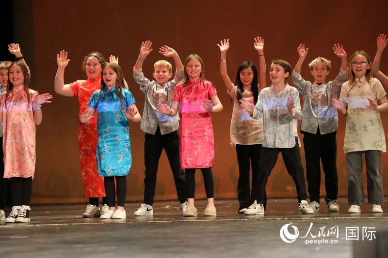 当地中文班学生表演《恭喜恭喜》歌曲节目。人民网记者 李志伟摄